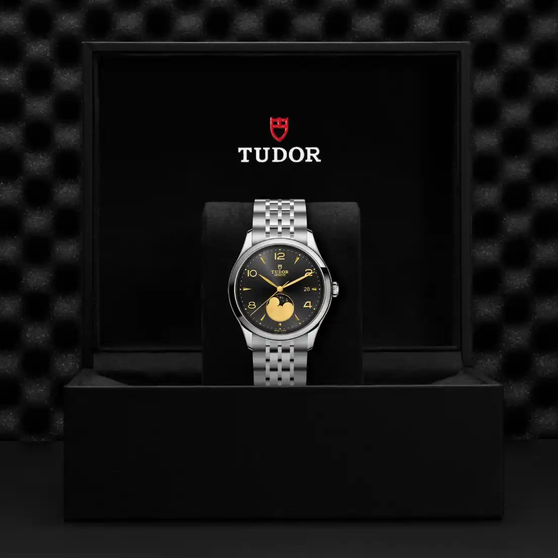 Black satin sun-brushed dial with applied numerals and moon phase indicator